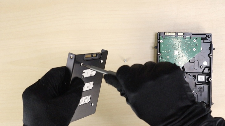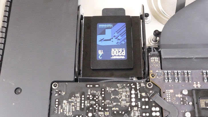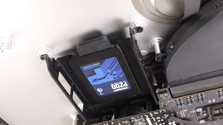 由於是 2.5 吋的大小,無法直接安裝在 iMac 中。所以要用 2.5 吋轉 3.5 吋的支架轉接,並從底部鎖上螺絲,固定住 SSD。