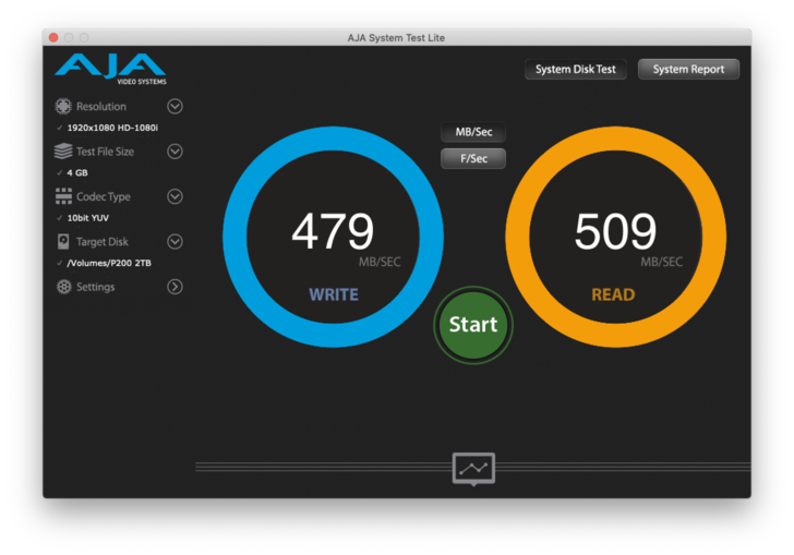 在 iMac 中以 AJA 測速,連續測試幾次寫入都在原廠速度以上,接近 480MB/s。讀取速度則在 500MB/s 附近。連續測試一段時間也沒有掉速,非常穩定。
