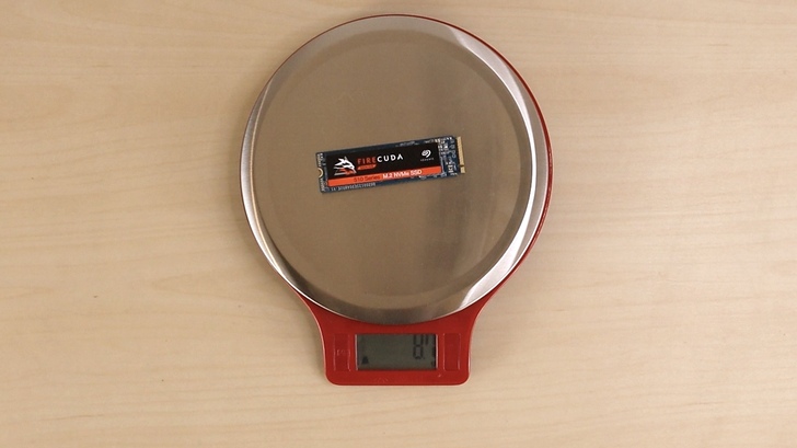 SSD 重量約 8.7g。可別小看這輕小的一片,這條 2TB 售價可是破萬,與相同重量的黃金價格差不多,不虧是半導體工業的結晶!