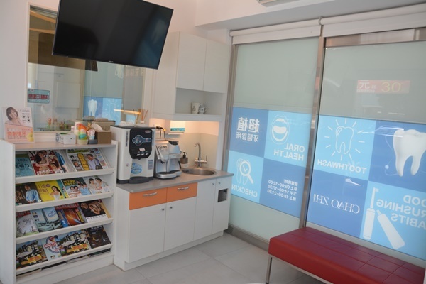 因為是一間雙門牌與深度兼具的店面,整個門面空間感相當明亮,候診區劃分為二,有書報、電視或一般沙發可以坐著等待,前方櫃上還備有各式各樣餅乾咖啡,茶讓等候人做取用,坐在柔軟沙發等候時若不想看書報院內還有免費WIFI可以連結使用,對我這個手機沒有吃到飽的人來說簡直是一大福音。