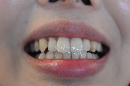 第二次療程-當天約略治療時間約一個小時左右,醫師會先請護士幫忙做第一次取模確認治療前牙齒大小及位置,然後再將補過的牙磨小再咬一次模來記錄要製作的牙齒大小,當然牙齒磨小就不太美觀,所以吳醫師就替我客製化做一顆臨時牙套充當暫時性門面,這個門面因為是臨時性相對色澤會比較侷限沒有那麼自然,不過若沒有細看也很難發現這是顆臨時牙套。