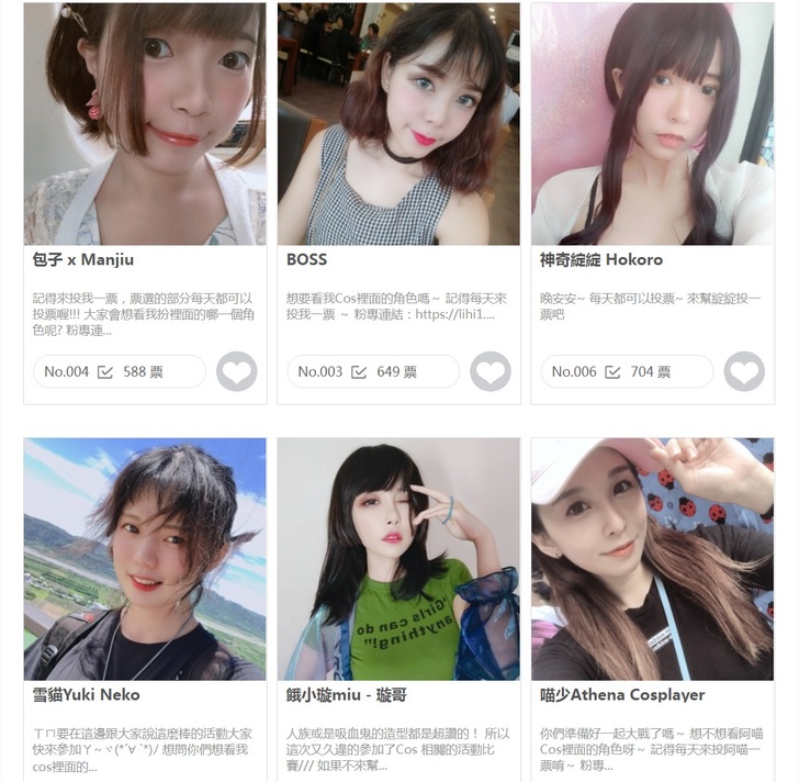 看看這6個Coser每個都有不同特色,想要每個都要也不知道行不行,反正每個妹都很正,而且點進去還可以看到她們粉絲團的Coser風格,其中也有不少Coser服飾跟裝備的質感都很讚喔!