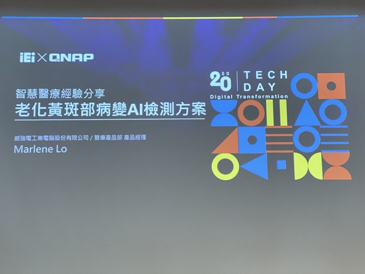 QNAP 與 iEi 的 AI 應用展示,提到在榮總等醫院使用 AI 檢測黃斑部病變。