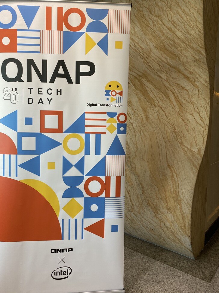 QNAP 在 2019 年 10 月 8 日舉辦 TechDay 2020,地點在交通部內的集思會議中心,五樓最大的集會堂。舉辦場地非常舒適,茶水供應也很完善,隨然離捷運站不算近,但還在可以步行的距離。有趣的是這個地點剛好在好幾個捷運站的中心點,所以不管從哪個捷運站都要走一段距離。但對自己駕駛汽機車前往的人來說,附近機車很好停,汽車也有停車場,整體來說對與會者的交通來說還是很不錯的。一早來到現場還沒什麼人,就先到場地中間拍個正面照。
