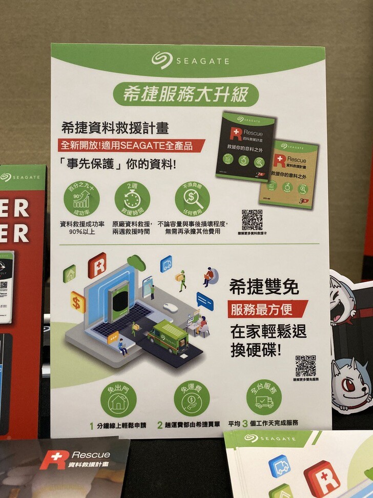 在 Seagate 的攤位也發現服務升級,以往送修運費是消費者與希捷各付一趟,現在完全由希捷買單,就是 DM 上寫的「雙免」,服務越來越好。
