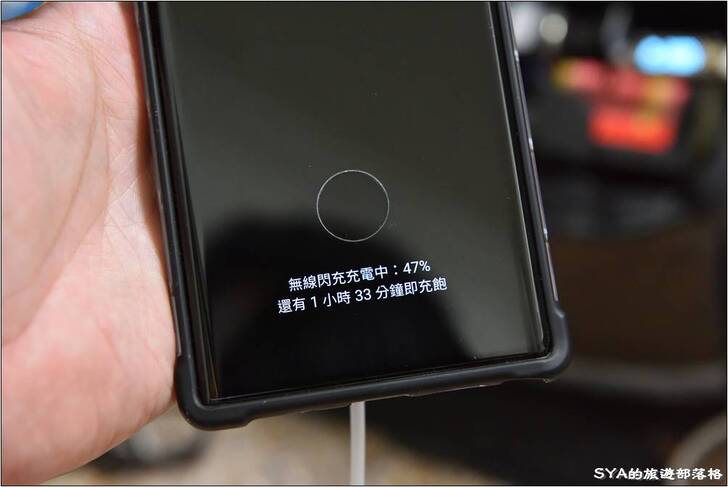 # 充電板的兩側都有一個白色的指示燈,在充電的時候會不斷的閃爍。(這張是以Note10+以連拍自動輸出Gif的方式拍Note9,手略抖,請多包涵)