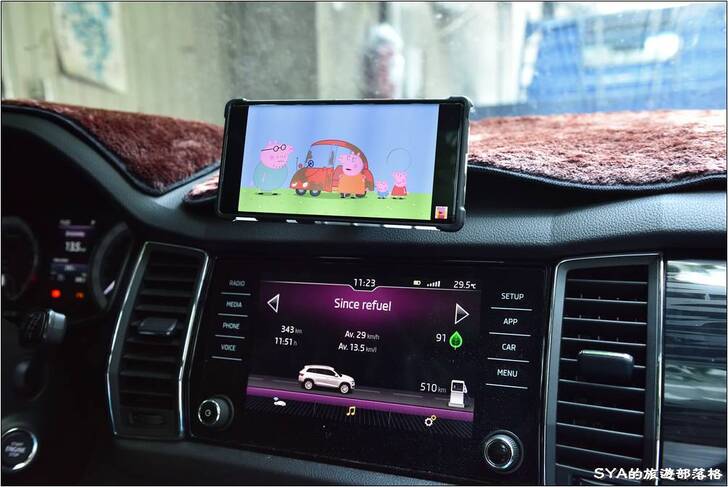 # 如果小朋友吵鬧、或是在休息站休息、用餐時,放個小影片也是不錯!且不僅可吸附手機,連家中的Pad放上去也不成問題。這個儀表板固定座可承受最高約1公斤左右的重量,這幾乎是12吋超薄型Notebook的重量了。