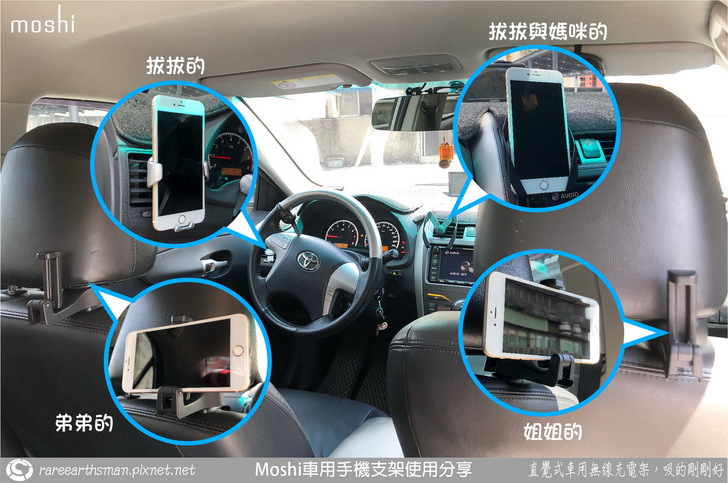 ▲現代人離不開手機已是不爭的事實,不管身處何地,身上都會帶著手機,就連在車上也是一樣,我們一家四口,雖然只有兩支手機,但是可以放手機的手機架卻有4個,駕駛座左側的手機架主要是拔拔在用,固定在左側的冷氣出風孔上,手機以直立式為主;中控台上方的冷氣孔手機架是拔拔跟媽咪共用,媽咪如果坐副駕駛座,手機可能就會放在這邊,如果坐到後座,這個位置可能就拔拔來使用,使用上也都以直立式為主;後座兩個手機架都是固定在前座頭枕後端,因為都是方便小朋友看影片為主,所以手機都是橫式來方便看影片,特別是長途開車旅遊時,大人的兩支手機都會被移動到後座來安撫小朋友。