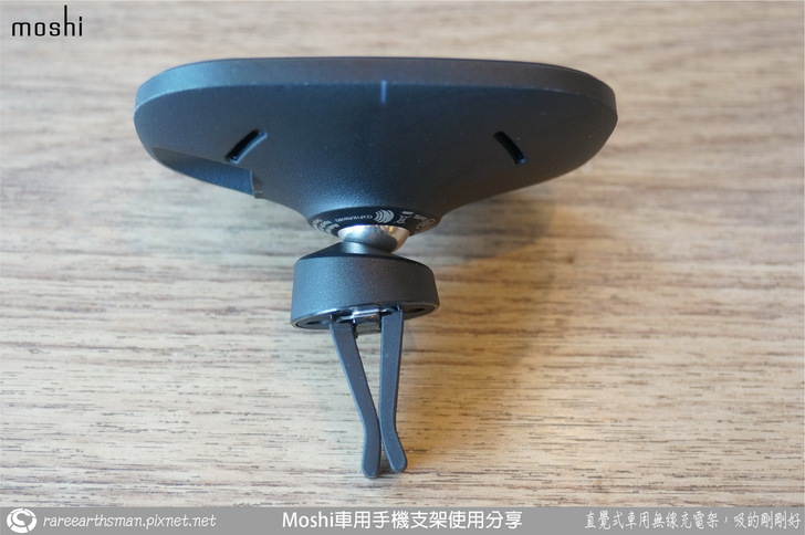 ▲支架的側視,圓球形軸承下方,也就是固定冷氣出風口葉片的固定結構,在造型上並不是設計對稱式的,這樣讓旋轉角度可以對應不同的狀況,讓無線充電座可以有更多的角度變化,所以如果使用上發現角度調不到適合的,那麼將無線充電座整個拔起來,然後轉個180度後再裝上去,也許會有不錯的角度變化以供使用,但是記得前方的磁吸支架部分也要旋轉180度,不然充電線會往上,會影響美觀也會影響開車的視線。