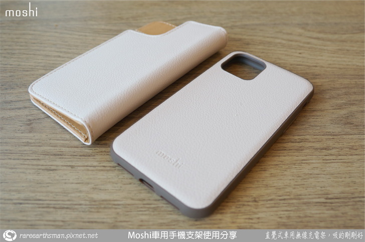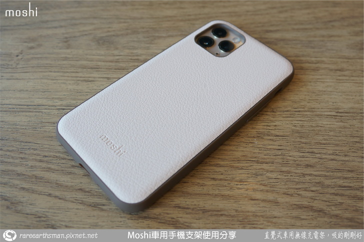 ▲皮套跟保護套的背面照,保護套的背面也是美背,背面也同樣貼上粉色的環保皮革,下方有moshi的標誌,保護套後面皮革的手感很好,止滑效果也很好。
