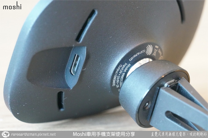 ▲支架後方有4個弧型的開孔,應該是散熱使用,畢竟無線充電要充到10W,何況是在車上使用,面對前檔玻璃外的高溫,解熱問題是很重要的;另外支架長邊兩側的中央都有燈號的顯示,兩個燈是一起亮,在手機放上去之後其實使用者會看不到燈號,因為會被手機擋住,有沒有充電其實要看手機螢幕上的顯示,如果沒有充電的話才會特別看一下後端的燈號是否正常,燈號是亮白燈,充電完成會持續亮燈,充電中會像呼吸燈,有狀況會閃燈。此外後端中央靠近轉軸的部分有印上許多的安規標誌,通過了滿多的規範與測試,使用者可以安心使用。