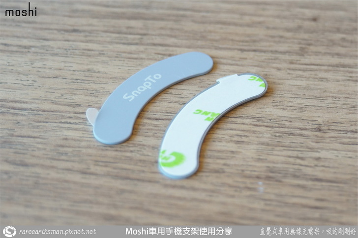 ▲SnapTo鐵片,一組是兩片,在SnapTo無線充電車架的包裝裡會有兩片,以供moshi SnapTo系列的保護殼來使用,車架與保護殼算是兩個產品,分開販售,有些人只會買殼,並不想用或者不需要用moshi它們的車架,如果後面先裝了鐵片,一靠近磁性物質就會磁吸,也會造成使用上的困擾,有需要再裝,所以鐵片是放置在SnapTo無線充電車架的包裝裡。而支架正面,也就是表面橡膠的兩端內側各設置了一片磁鐵,相對的結合位置在保護殼上就會需要貼上這兩片SnapTo鐵片。