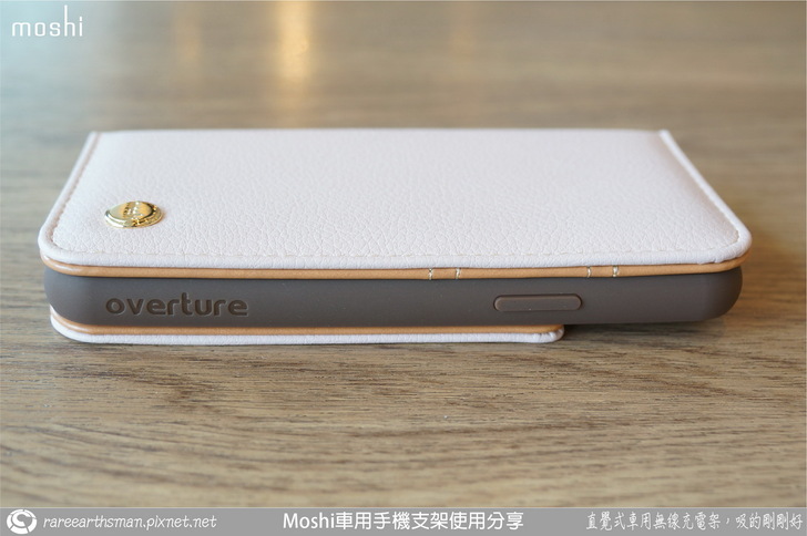 ▲overture保護殼的側面,其實overture保護殼設計上有三種顏色,皮套的外側是粉色皮革,內側則是使用皮革原色的搭配,而最內層的手機套則是咖啡色的設計,是不是很有層次感,而外層前端的金色moshi五金扣件,就感覺有點畫龍點睛般的點綴。