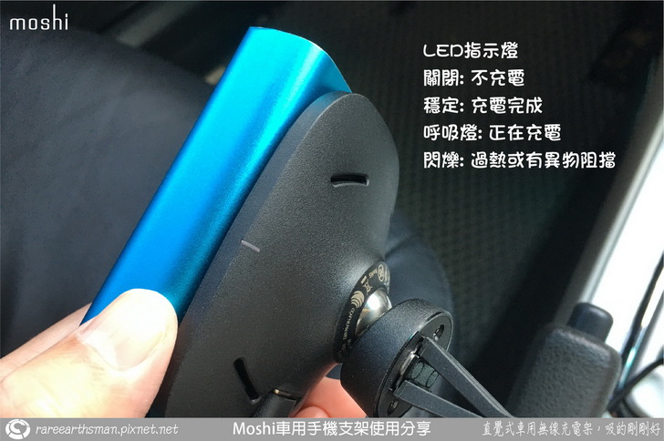 ▲其實SnapTo無線充電支架上是有燈號的,只是燈號位置在於支架背面的兩側,在正常狀況下,手機會完整的遮住支架,使用者是看不到這個燈號的狀態,以我使用無線充電盤的經驗,以及市面上販售的無線充電座都會有清楚的燈號顯示,moshi這時設計走的方向卻跟大家不一樣,有時想想這樣的顯示資訊是否適當,後來我覺得這樣的顯示資訊也沒什麼不好,反正有沒有在充電都會在手機螢幕上顯示,如果硬是想要在支架上看到燈號,勢必要將支架面積擴大才有可以在支架正面看見燈號,這個部份我想是一種取捨啦。而圖片只是示意如果充電盤前方並不是放手機,而是放其他金屬物的狀況,這樣支架是會偵測異常出現閃燈。