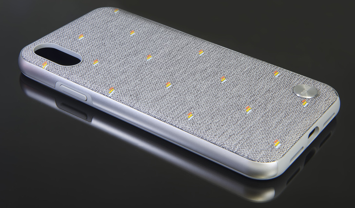 ▲Vesta 布質背蓋殼共有三個顏色,分別為:馬卡龍粉色、灰黑色、森綠色(上圖為灰黑色款)。背面的布面材質是聚酯纖維,側面為金屬光澤的塑膠及橡膠組成,邊框不是金屬材質,所以不會影響到手機訊號
