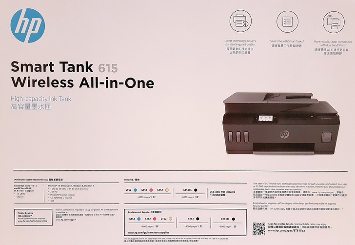 ▼ 包裝正面:HP Smart Tank 615實機照 還有 特點說明。
