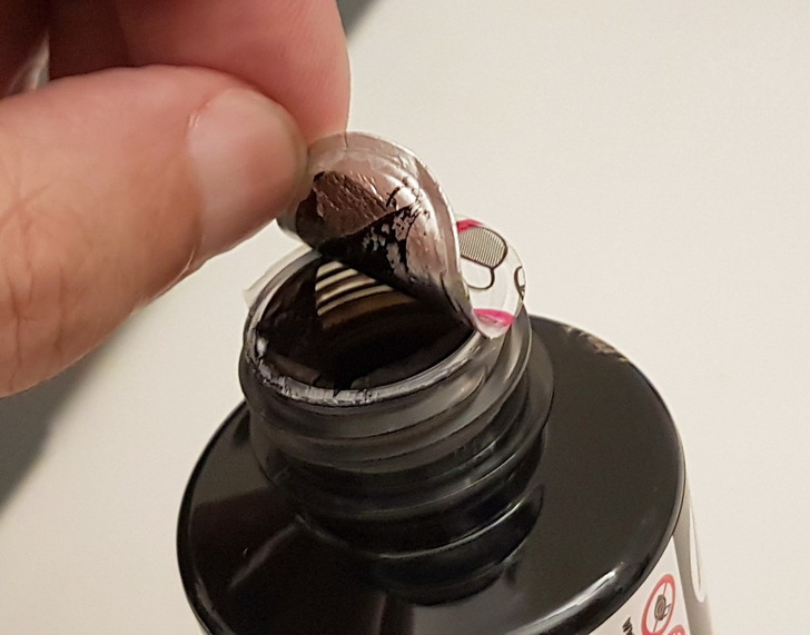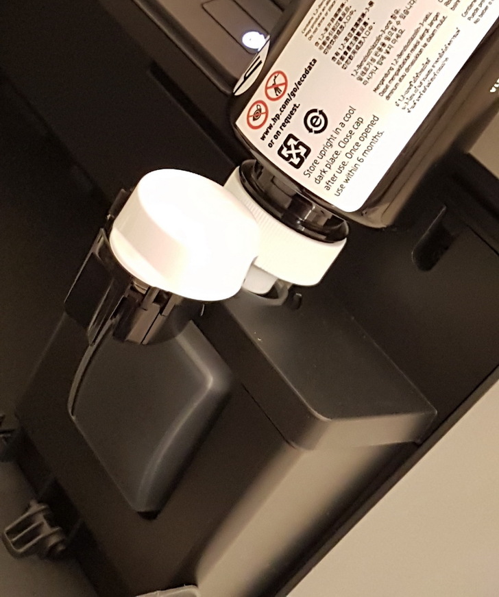 ▼ HP墨水瓶 首創不沾手設計,蓋子要先打開,撕開保護膜之後,對準墨水槽插下去,就會自動灌滿墨水槽。