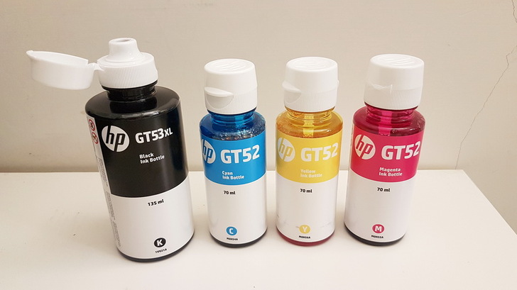 ▼ HP的墨水瓶 設計得剛剛好,一瓶都剛好填滿墨水槽。(黑色GT53XL容量135ml、三色的GT52容量70ml)