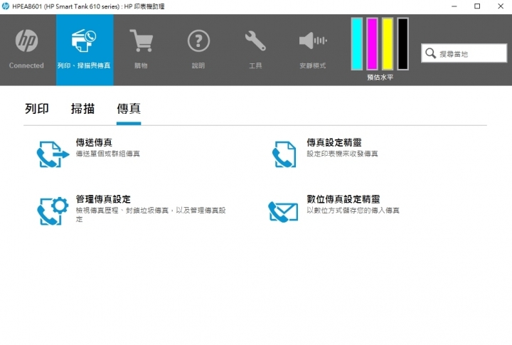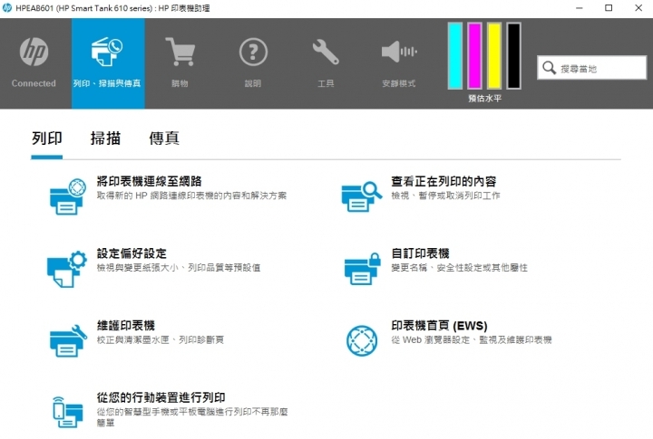 ▼ HP Smart 連接印表機之後,就會看到如此的頁面。(蘋果手機頁面的排列會有所差異。)