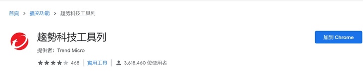 首先進入 Chrome 線上應用程式商店搜尋「趨勢科技工具列」然後把它加入 Chrome 就完成了擴充套件的安裝。