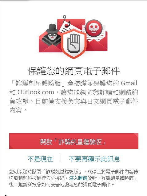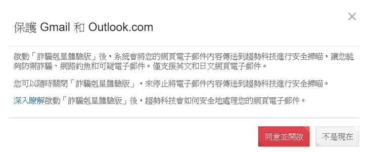 詐騙剋星體驗版:這是一個透過主動掃描郵件來防禦網路詐騙和釣魚攻擊,不過目前這還是一個先行體驗的功能它支援主流的郵件服務(Outlook 與 Gmail),現在僅支援英文與日文網頁電子郵件內容。
