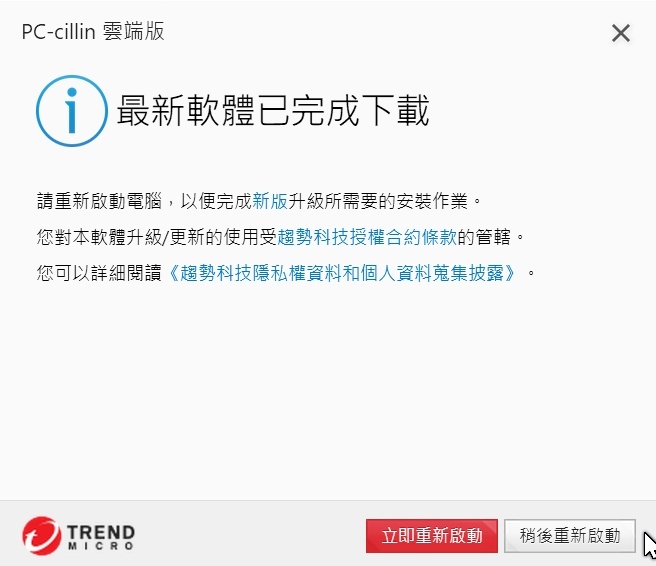 再來下一步是重新開機進行 PC-cillin 2020 雲端版的安裝