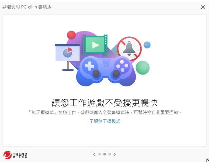 再來是在 PC-cillin 2019 時我就很喜歡的無干擾模式,當我必需長時間使用電腦不管是在打文章、玩遊戲還是看電影的時候都不會被不重要的通知所干擾,而且這還包含了作業系統的部份,對於需要專心使用電腦的使用者來說是相當重要的。