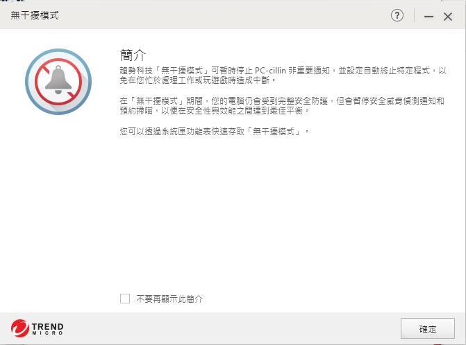這是用在工作或是玩遊戲時,萬一視窗跳出一個通知,不僅影響工作思考,也會讓電腦中斷或是GG。因此PC-cillin 2019雲端版貼心的提出這樣的模式,讓使用者在工作或是遊戲時不受干擾