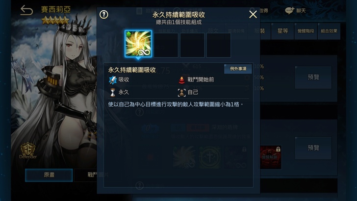 在防禦型傭兵這邊其實猶豫蠻久,因為各有各的好處,最後決定選擇就戰術長遠方面考量來決定,選擇了賽西莉亞(萬聖盾),雖然坦度稍嫌不足,但可以透過鐵壁或是活力符文補足他的自身坦度,其技能永久持續範圍吸收,可將以他為中心進行攻擊的敵人,所進行的攻擊範圍縮小成一格,只要放對位置,吸收對了!可以大幅度的降低隊伍整體的傷害,後期打PVP也是蠻好用的,所以陣型的擺法也很重要。