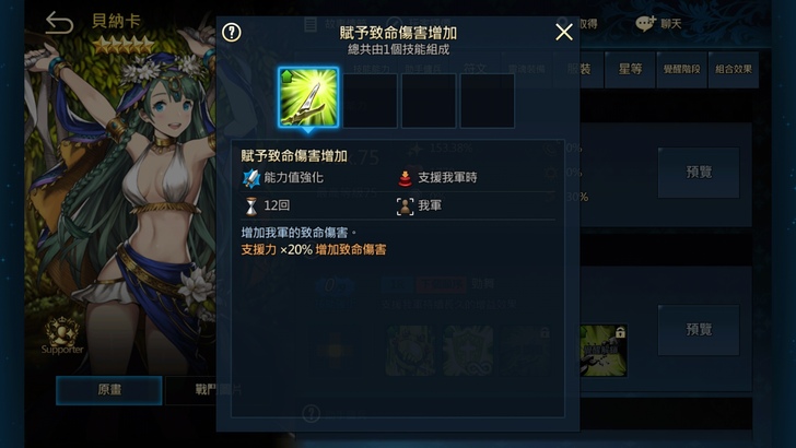 至於在支援型傭兵,個人取向為貝納卡(舞孃),除了支援範圍為十字較廣,更重要的是,其支援有高達35回合的提升20%攻擊力,加上每回合固定2%的回血,另外還有提升20%的致命攻擊,算是非常好用的BUFF,而且持續回合相當的長。