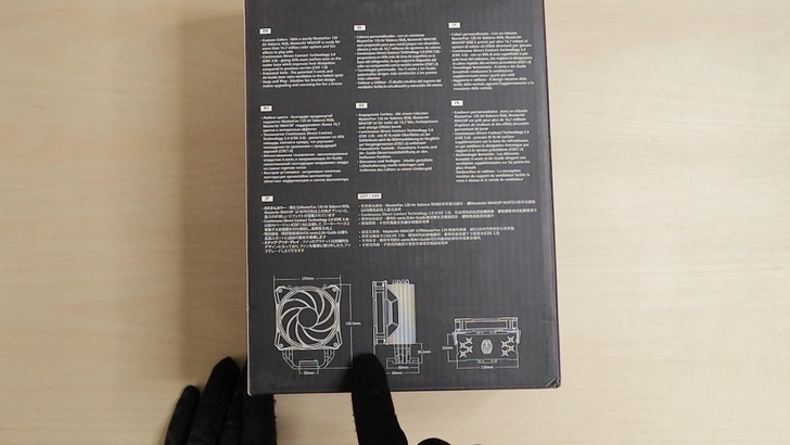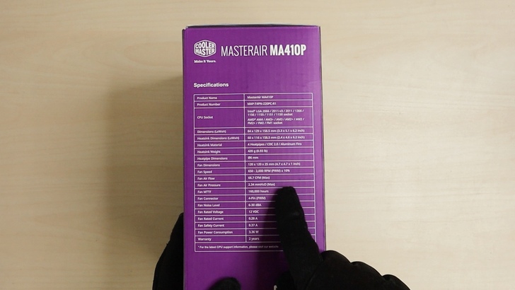 盒裝側面紫底白字,有詳細規格表,可以對照確保機殼裝得下。這次搭配的同樣是 Cooler Master 的機殼 MB500,看了一下高度,應該是不會有問題!