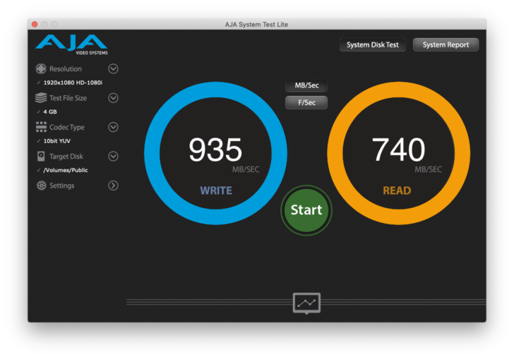 以 AJA System Test 測速寫入在 900~950MB/s,讀取在 700~750MB/s。