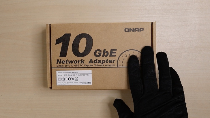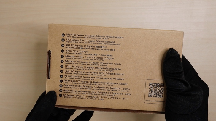 QXG-10G1T 是單埠的 10GbE 擴充卡,產品的包裝就是簡單的紙盒,背面有多國語言的產品名稱。