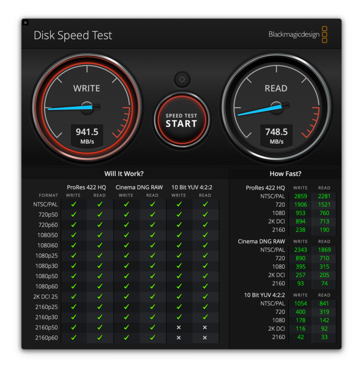 以 Blackmagic Disk Speed Test 測速寫入在 900~950MB/s,讀取在 700~750MB/s。10GbE 連線建置完成!