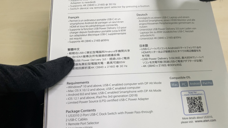 背後也有繁體中文說明,下方也有近一步的規格、內容物說明。支援 macOS、Windows、Android、iPad Pro,能夠支援 iPad Pro 算是比較少見的功能。