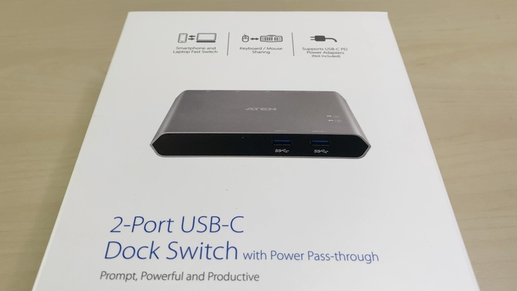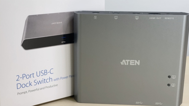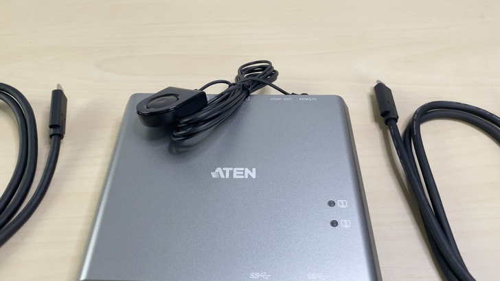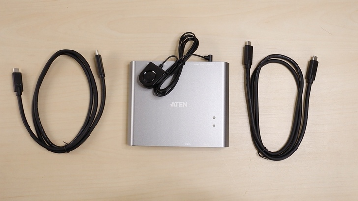 ATEN US3310 主機、兩條 Type C 傳輸線、一條切換按鍵。主機頂面有兩個指示燈,方便使用者知道現在的訊號來源。
