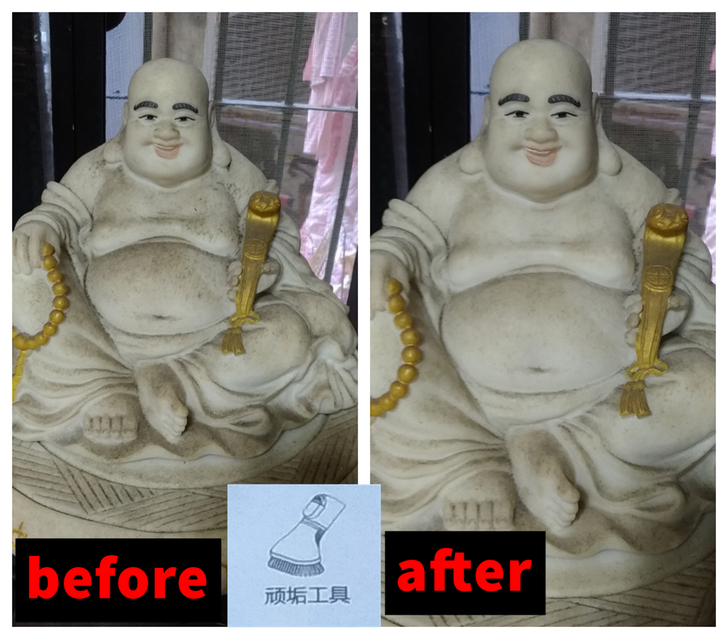 再來就是古老城堡總是會有很多石像,所以就連彌樂佛身上的灰塵也可以用A9+中的二合一刷頭輕鬆處理。(旁白:其實整尊拿去洗不是更方便,但1樓的灰塵真的很多,若常整尊拿去洗真的太累人了,因為衪真的不輕)