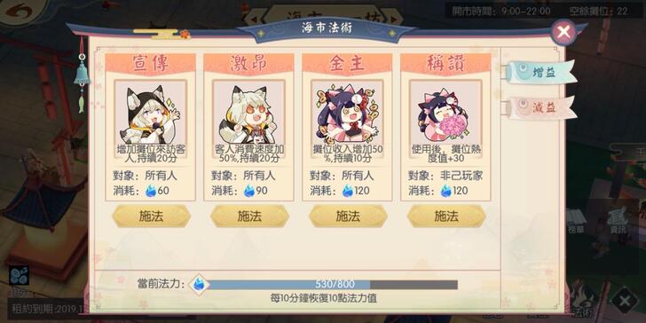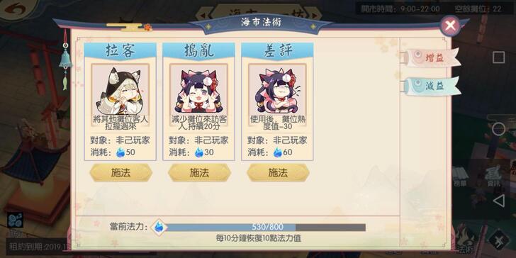 海市經營有額外的排名積分獎勵,相當競爭呀!所以還能施法增益或減益效果(類似拉客、下咒等等),非常有趣~海市剛開時,都會想去隔壁攤下咒,把別人的客人吸過來,現在開久了就知道,法術值相當有限,為自己施法增益都快不夠了吶!