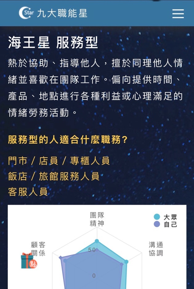我最後的結果是海王星服務型,剛好符合我目前就是從事相關工作內容,完全被抓到心理,真的很準很強大的工具。