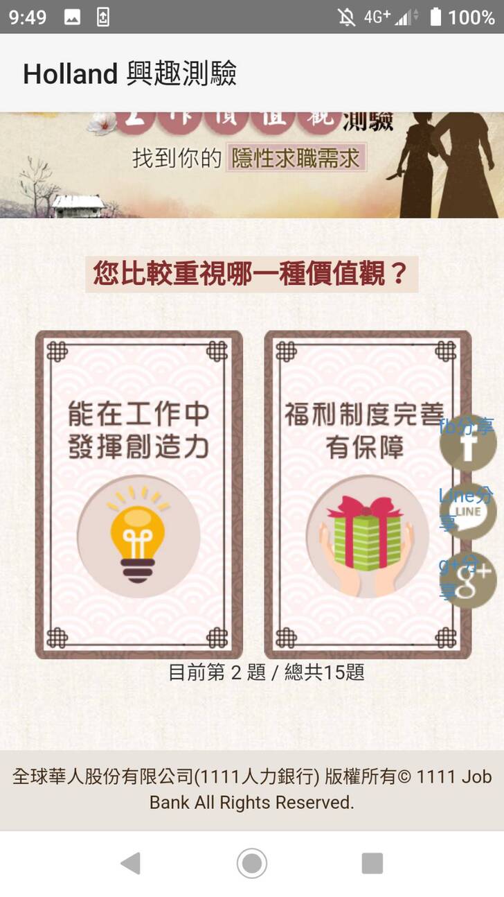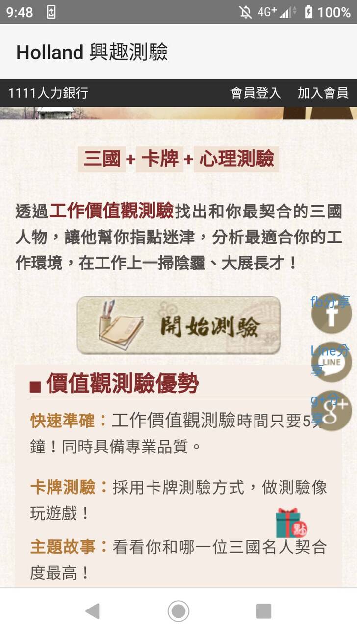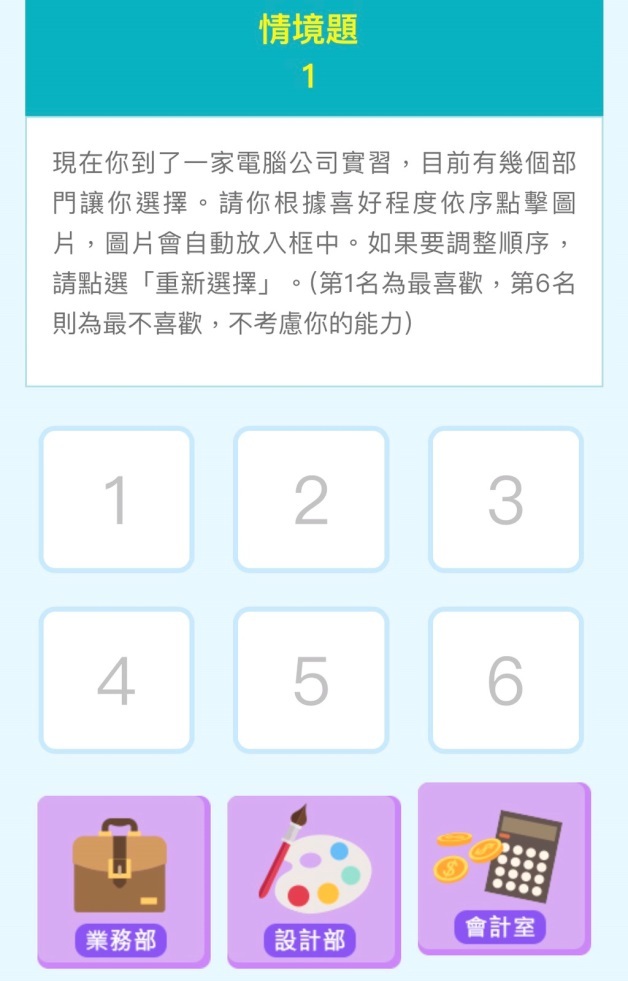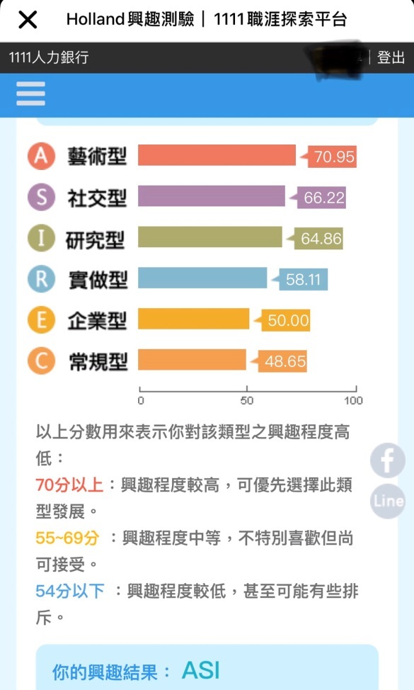 其實我一開始用APP的時候就是先點了工作價值觀測驗,這個有好幾道題目,每一題都有2張卡牌可以選擇自己所喜好的,最後會出現你的工作價值觀代表的 三國人物是哪位。後面我又作了Holland職業興趣測驗,會依造你的興趣跟能力,一共有10道題目,花不到5分鐘,最後的結果讓我蠻訝異的,原來我的性向是這麼貼近藝術,我想我之後的工作類型會朝這個結果去努力看看。