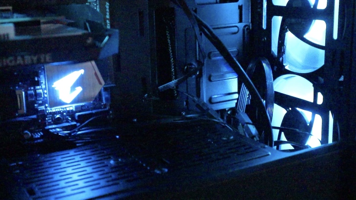 關燈,開機!哇~滿滿的燈效,不過目前主機板和機殼上的風扇還沒同步,後續我們會透過技嘉的工具程式 RGB Fusion 2.0,可以選擇不同模式的 RGB 燈校,也可以調整顏色、速度、亮度等參數。