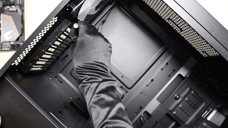 不需螺絲起子即可拆卸的壓花螺絲,整個拆裝機的過程都很順手。在電源供應器的前方,還有兩個抽屜可以透過支架安裝 3.5 吋或 2.5 吋的儲存裝置。