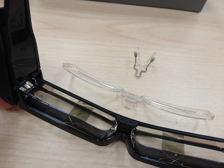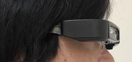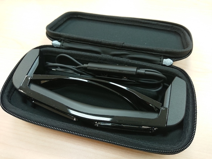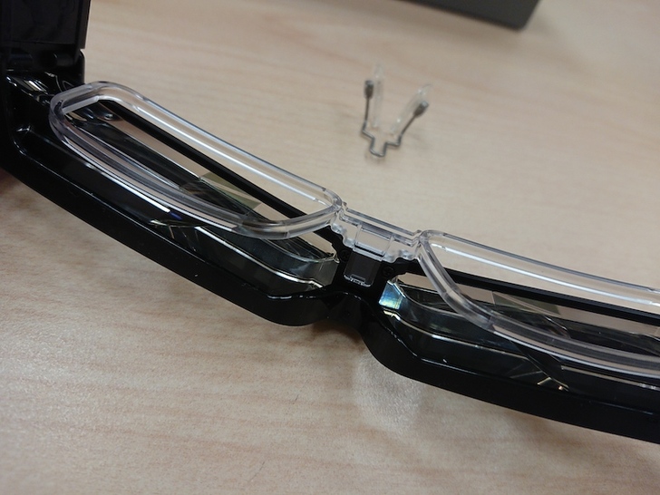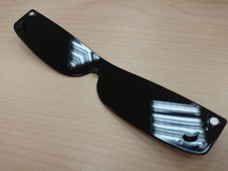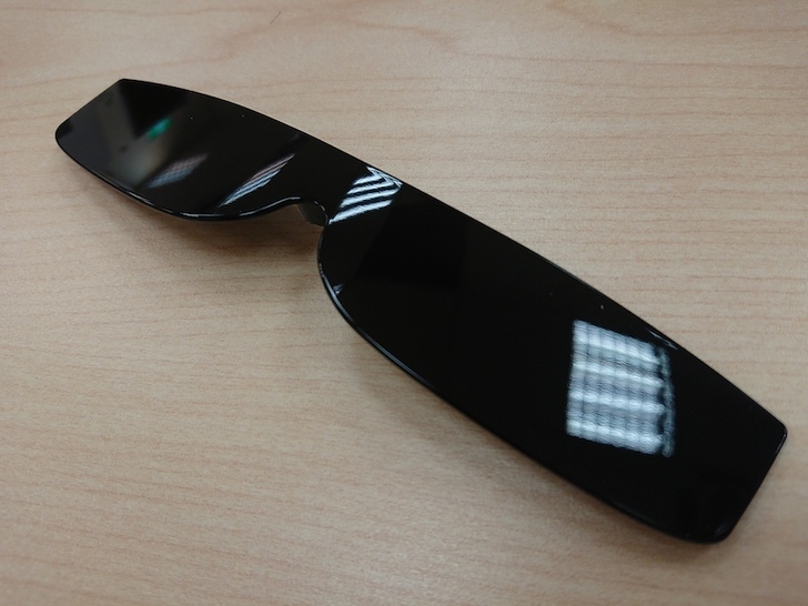 ▼由圖中可以看到眼鏡是亮面塑膠材質,左右兩側凸起物為投影裝置,其原理是將影像由側面投影至鏡片中間處的反射面,折射到佩戴者的眼睛成像,而傳輸線則是由左側投影裝置下方出來。
