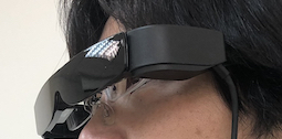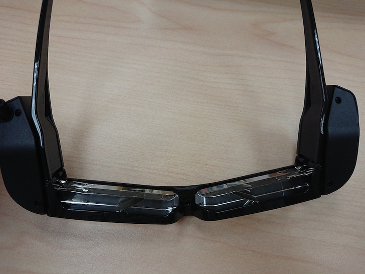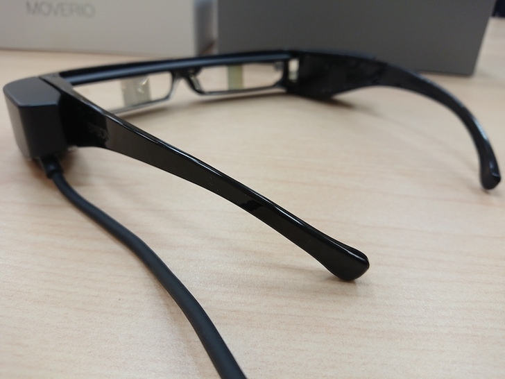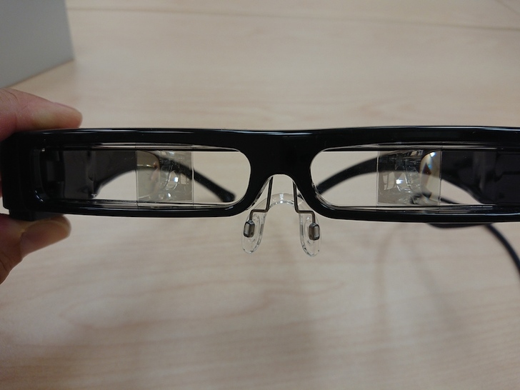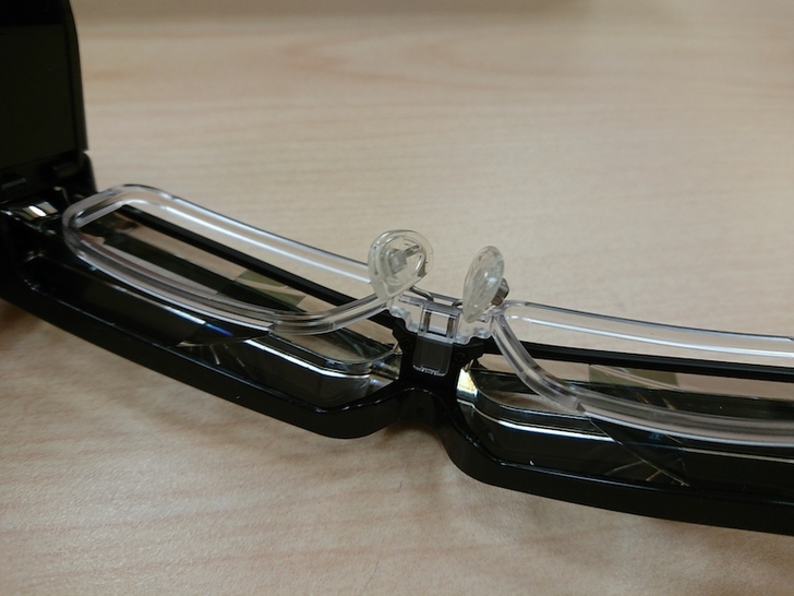 ▼從右邊這個角度可以看到,MOVERIO BT-30C的鏡片是由透明的塑膠鏡片所組成,它具有一定的厚度,中間嵌入半透明的影像投影折射面,由於影像是透過投影折射面成像,所以鏡片表面如果刮傷是不受影響的。