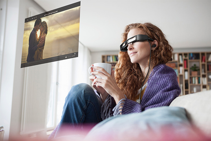 在觀賞影片的時候,就像下面的示意圖一樣,非常輕鬆自在隨時隨地都可以獨享大畫面的電影,不論是開app追劇或是打Game都非常炫,因為,只要一隻EPSON MOVERIO BT-30C你能隨時隨地享受大電視的體驗