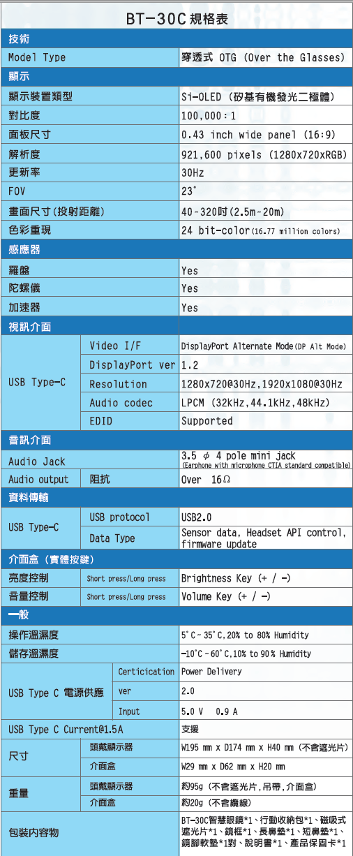 EPSON MOVERIO BT-30C的詳細規格如下表所示