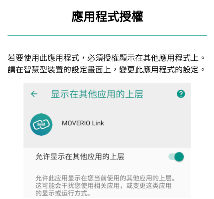 安裝完後開啟MOVERIO Link會出現應用程式授權頁,要勾選允許顯示在其他應用的上層,這樣使用MOVERIO BT-30C時才能在畫面上做調整與設定,另外也可勾選啟動應用程式,這樣連接眼鏡時就會自動開啟Moverio Link。