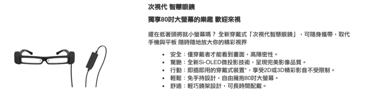 由EPSON官網的截圖可以看到EPSON MOVERIO BT-30C主打的功能,可以隨時隨地獨享大螢幕的樂趣。