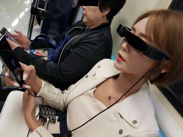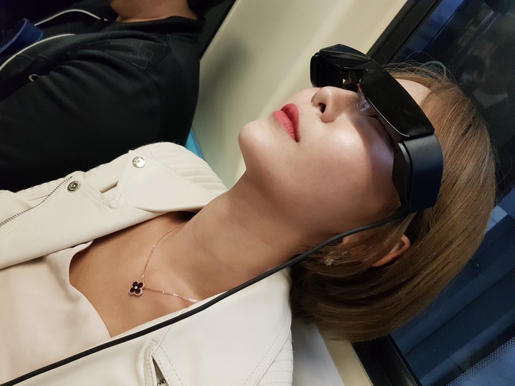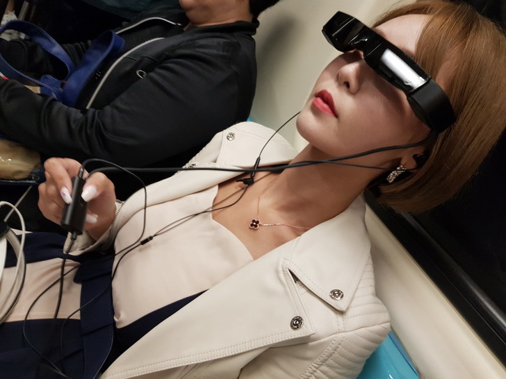 ▼ 其實 BT-30C 就跟一般眼鏡一樣,坐捷運時並不會顯得特別的突兀;況且如果沒有把手機螢幕調亮,根本不曉得戴著 BT-30C 的人在看什麼?