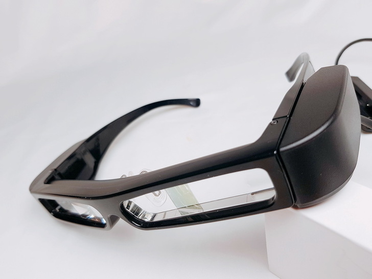 BT-30C 厚厚的鏡片上卻是搭載了有 HD 畫質的高精細 Si-OLED 微顯示技術,外觀看起來全透明的鏡片中只能看到斜置螢幕,而這也是讓使用者可「兼顧娛樂性以及安全性」,在使用 BT-30C 的同時,對身旁的環境也能充分掌握。
